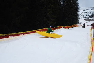 Vikend po našom prvom vilete na Plattling sme opeť nabalili kajaky a vidali sme sa na cestz. Tentoraz smer Chopok juh na dobre známu chatu Kosodrevina kde sa konali preteky v kajakovani na snehu. Na miesto konania sme dorazili už v štvrtok dobeda aby sme pomohli so stavbou trate. Ale v tom čase sa už Jožko Černý premával na ratraku po svahu a staval trať. Naša predstava o trati na snowkayak bola trochu iná ale nakoniec to bolo vpohode. Len ako sme neskvor zistili tých bubnov tam mohlo byť trochu menej. Viacmenej sme sa ale snažili zachrániť čo sa dalo a urobiť trať čo najbezpečnejšiu. V Piatok sme ešte doladili na trati čo bolo treba a začali sme trať skúšať, najprv na kajaku a potom aj na rafte. Pre kajak to nebol zrovna idealna trať kedže som mal pri jazde pocit že viac času travim vo vzduchu ako na zemi. To sa hlavne nepačilo mojej chrbtici ktorá si tvrdé nárazi dostatočne vychutnala. Na rafte to zato bola super adrenalinova jazda a na štastie raft večšinu nárazov stlmil.