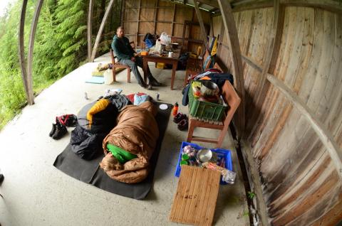 Vecer spime v starej skole kde sa mato bavi prikladanim do ohna pri tom ako si che osvetlit budovu na foto a tak si robi 2 metrovu vatru hned vedla nasej celty na spanie